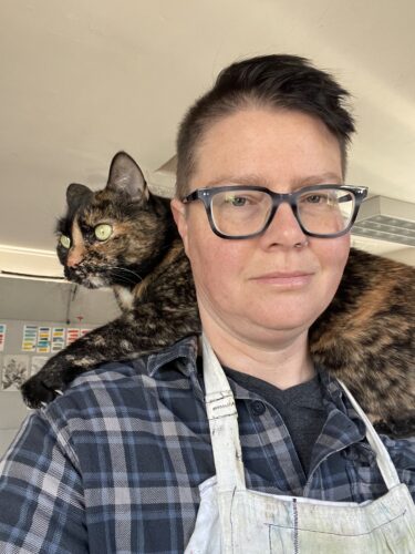 Ren Cannon is a printmaker, ceramicist, and painter based in Denver, CO. Ren works extensively with teens and youth as an art instructor at the Art Students League of Denver and in their previous role as teen librarian for 19 years at the Denver Public Library. Ren works with youth because they love the energy, curiosity, and perspective that young people bring. They feel strongly that helping connect youth to their internal thoughts and current events enables young people to think critically, help manage emotions, and gives them a creative outlet to deal with things in a productive and intentional manner. Ren is trained in trauma informed care practices, teen brain development, and verbal de-escalation techniques.